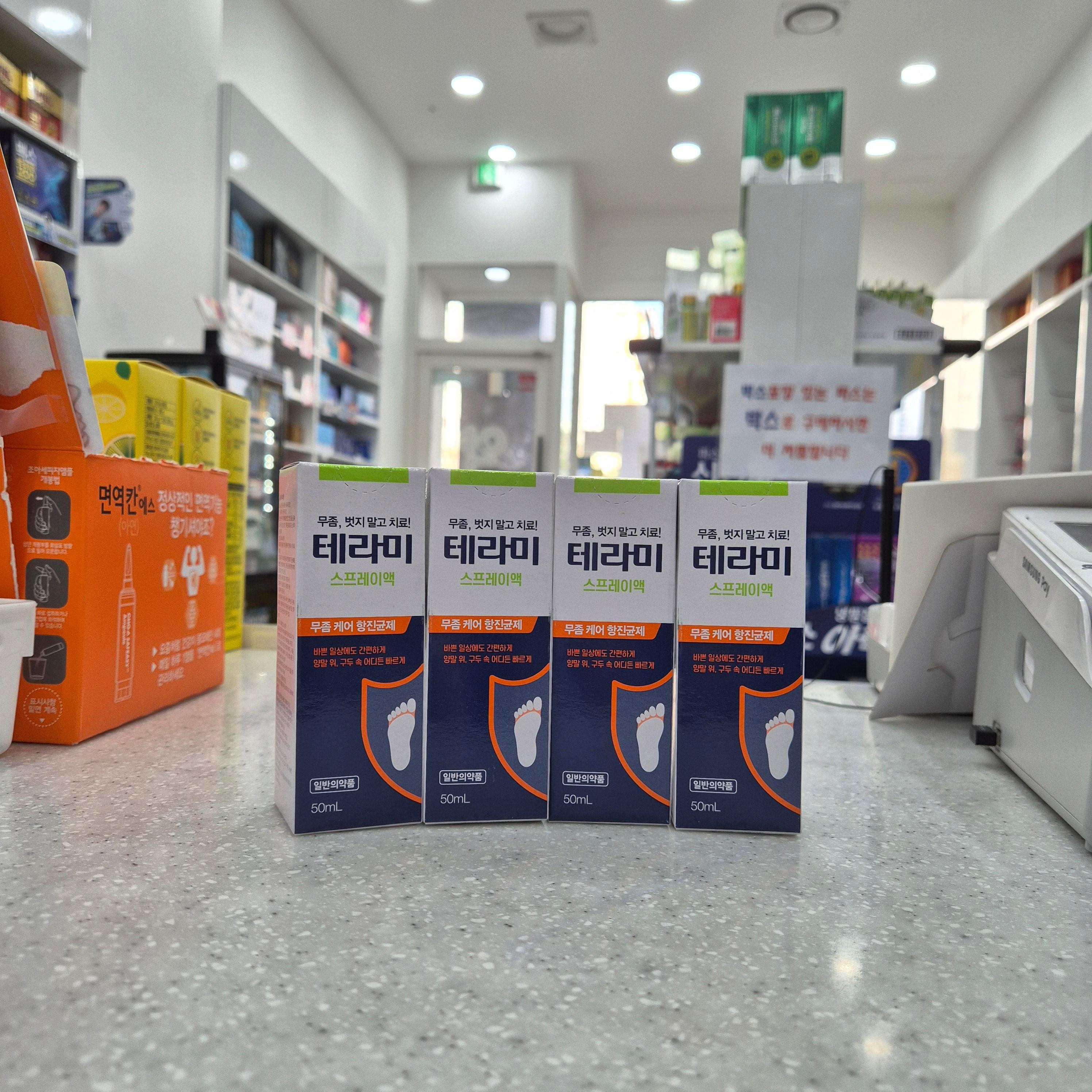 ‘테라미 스프레이액’은 무좀이나 습진, 가려움증 등에 사용되는 복합 외용제예요.